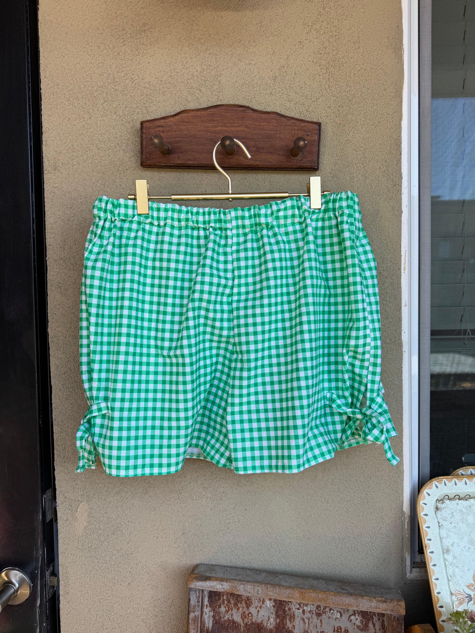 Fresh and fun, these green gingham shorts bring a classic vintage feel with a playful twist. Made from soft, breathable cotton, they feature an allover green-and-white check pattern that’s perfect for warm days or cozy lounging.