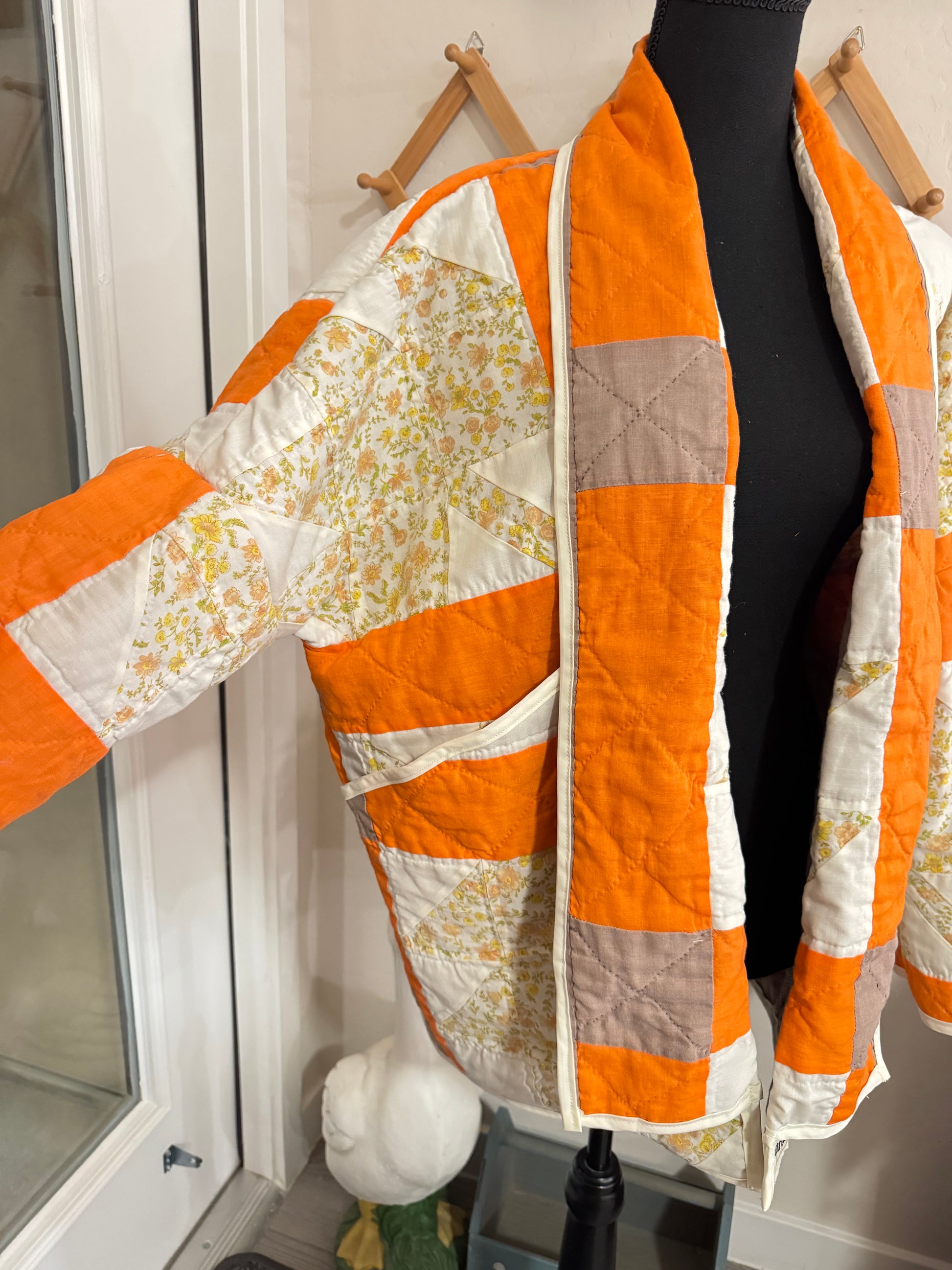This cozy quilted jacket is handmade from a vintage patchwork quilt, featuring bold blocks of bright orange, soft beige, floral prints, and cream. Its oversized fit makes it roomy and comfortable, perfect for layering over sweaters during the fall season. With deep front pockets and a relaxed open style, this jacket is as practical as it is stylish.