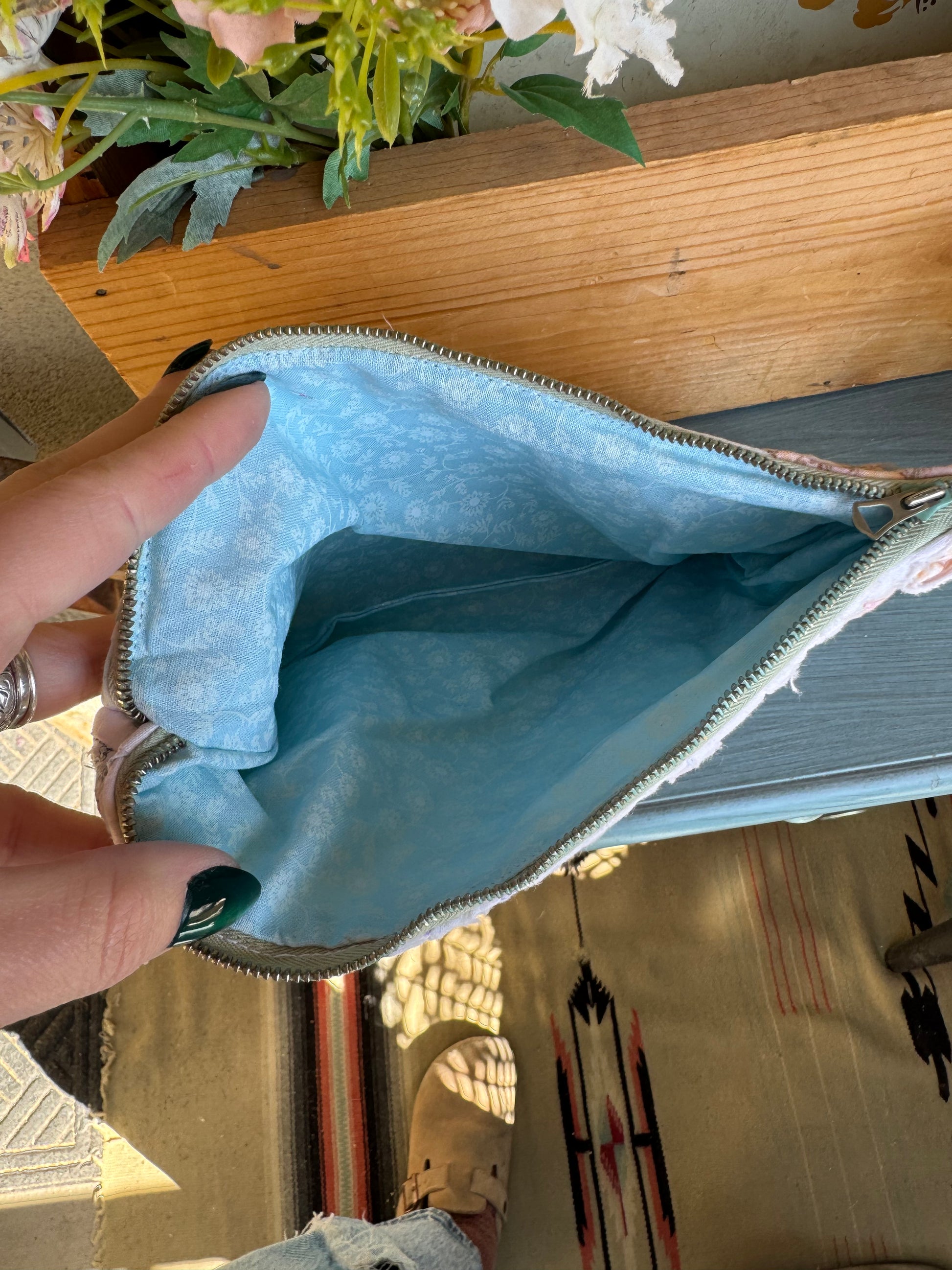 This soft and dreamy zipper pouch is made from a vintage quilt in shades of lilac, lavender, pale blue, and floral prints. The pine-style patchwork gives it a classic heirloom look, while the worn-in texture adds charm and authenticity.
