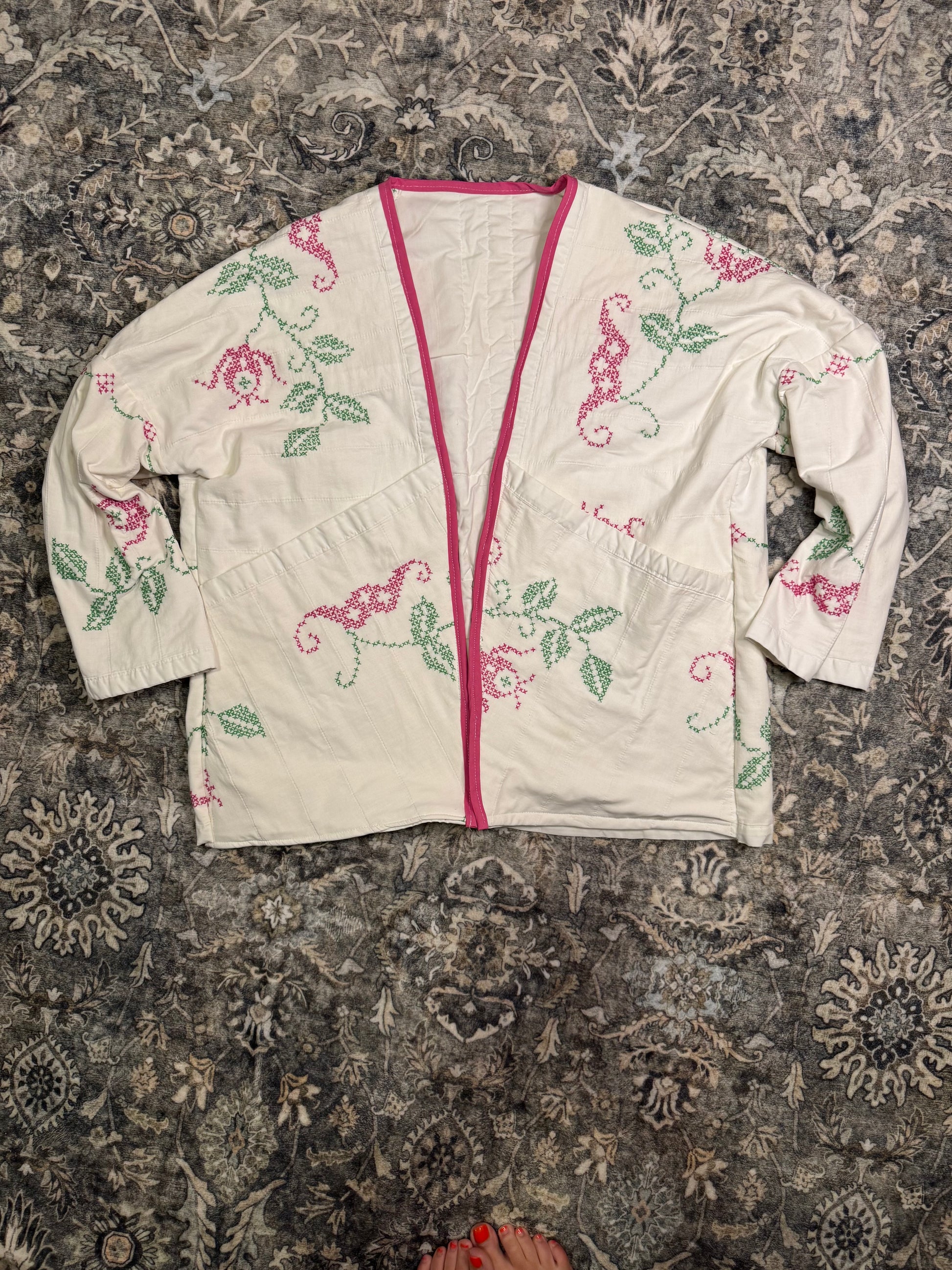 This one-of-a-kind jacket is made from a vintage embroidered quilt, featuring delicate rose motifs in pink and green stitched across a cream background. Trimmed with a bold pink binding along the open front, it combines classic cottage charm with a modern, relaxed silhouette.